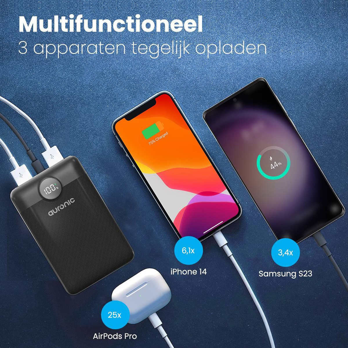 Of je nu thuis bent, op de camping, op een festival of gewoon onderweg, de Auronic Powerbank 20.000 mAh is een onmisbare accessoire voor iedereen die graag verbonden en opgeladen blijft. Met zijn snelle oplaadmogelijkheden, draagbaarheid en innovatieve functies is dit de ultieme energiebron voor jouw elektronische apparaten. Kies voor de Auronic Powerbank en ervaar zelf het gemak en de betrouwbaarheid van deze krachtige, veelzijdige en draagbare energiebron. Een powerbank kopen van Auronic is daarom dé oplossing wanneer jij op reis gaat.